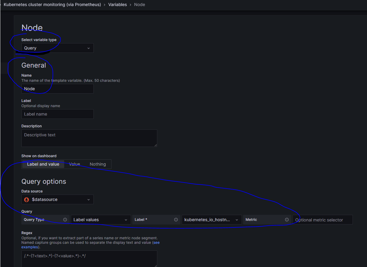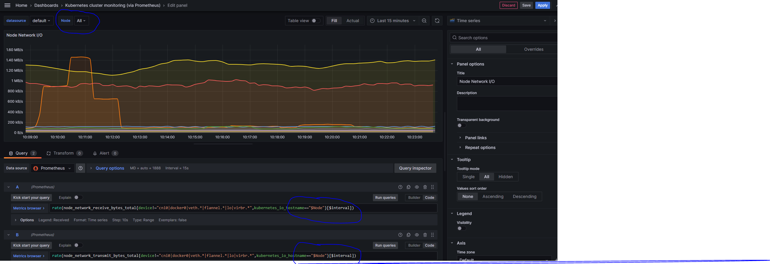 在 Dashboard 中定义了这些变量后,可以在 Panel 的 Query Editor 中使用,在 Query Editor 中使用了 Variables 中定义的变量后,在 Dashboard 的顶部下拉菜单中可以选择预定义的变量的值(需要在定义 Variables 时配置 Show on dashboard 为 Label and Value 以使在 Dashboard 顶部显示下拉菜单),Panel 中的 Query 表达式就会使用这些变量的值进行计算以及显示图表。
