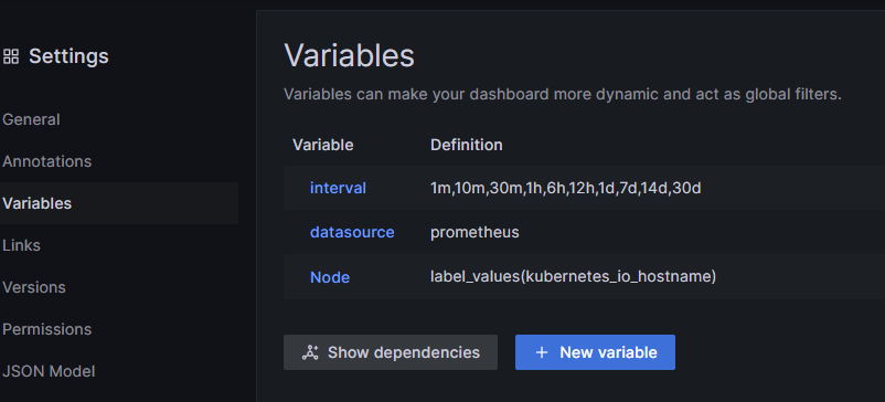 Panel - 在一个 Dashboard 中,Panel 是最基本的可视化单元。通过 Panel 的 Query Editor 可以为每一个 Panel 添加查询的数据源以及数据查询方式。每一个 Panel 都是独立的,可以选择一种或者多种数据源进行查询。一个 Panel 中可以有多个 Query Editor 来汇聚多个可视化数据集Row - 在 Dashboard 中,可以定义一个 Row,来组织和管理一组相关的 Panel在 Dashboard 的设置页面中,有 Variables 页面,在其中可以为 Dashboard 配置变量,之后可以在 Panel 的 Query Editor 中使用这些预定义的变量。变量的值也可以是通过表达式获取的值。也可以在 Panel 的标题中使用变量