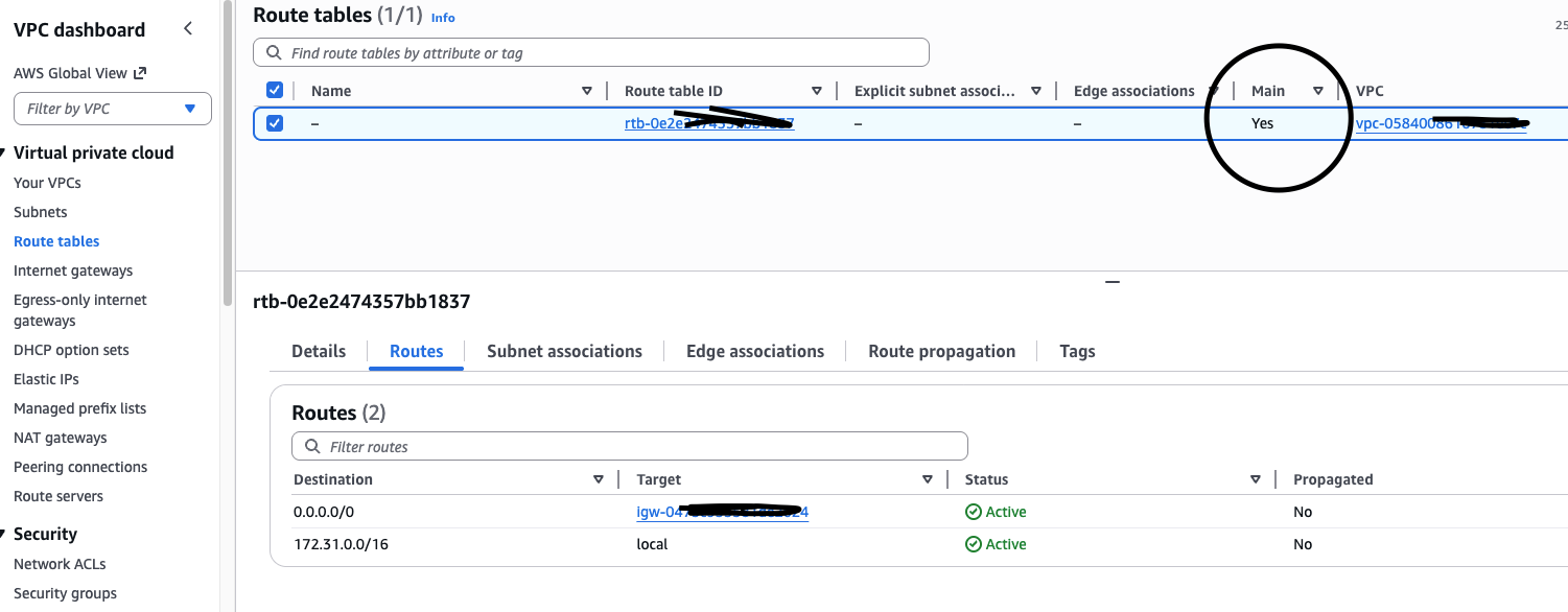 VPC 默认的 Main Route Table 已经满足这个条件,其默认网关为 Internet Gateway