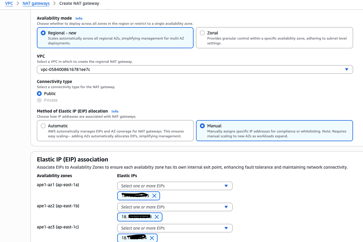 在 NAT gateways 标签页面中,点击 Create NAT gateway , Connectivity type 选择 Public , Elastic IP (EIP) association 选择 手动分配 EIP(Manual)
