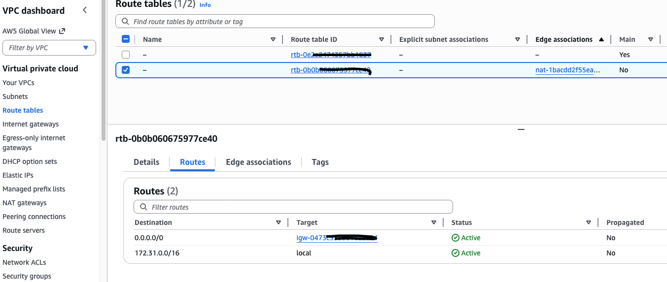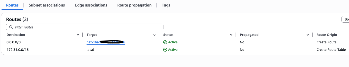 创建完成后,状态应为 Available 。在路由表(Route Tables)中,这时会多一个路由表,其 Edge associations(边缘关联) 关联到了刚刚创建的 NAT Gateway