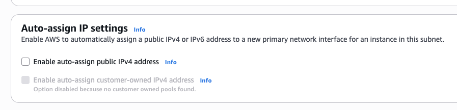 在 VPC → Subnets → Create subnet 标签页面中创建新的子网, 不要勾选 Auto-assign public IPv4 ,如此处于此子网中的实例,不会为其分配公网地址