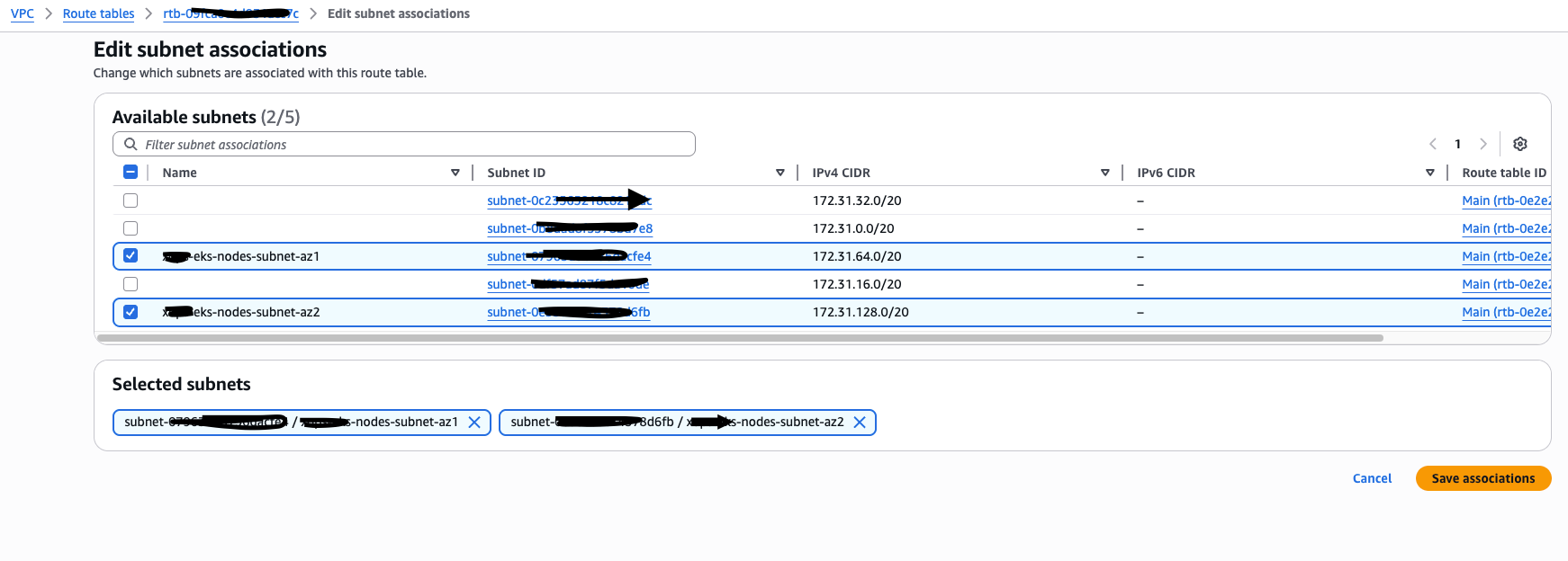 选择刚刚创建的新路由表 private-rt,在 Subnet associations(子网关联) 中 Edit subnet associations(编辑子网关联) ,选择目标子网进行关联